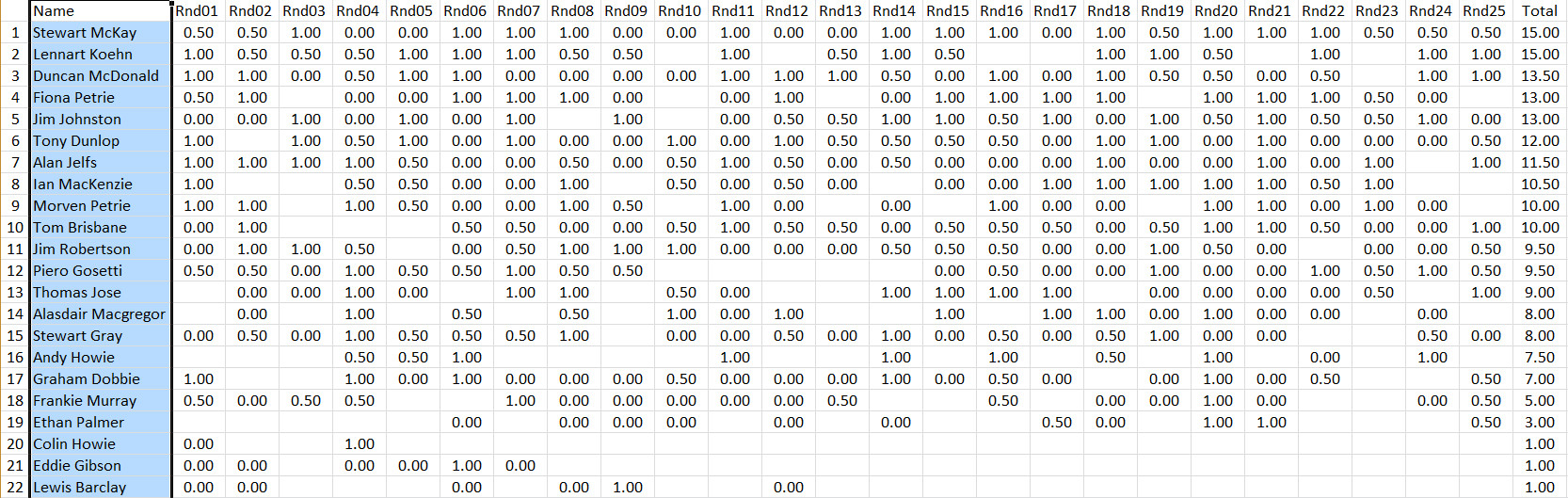 Performance in games played against other club members: