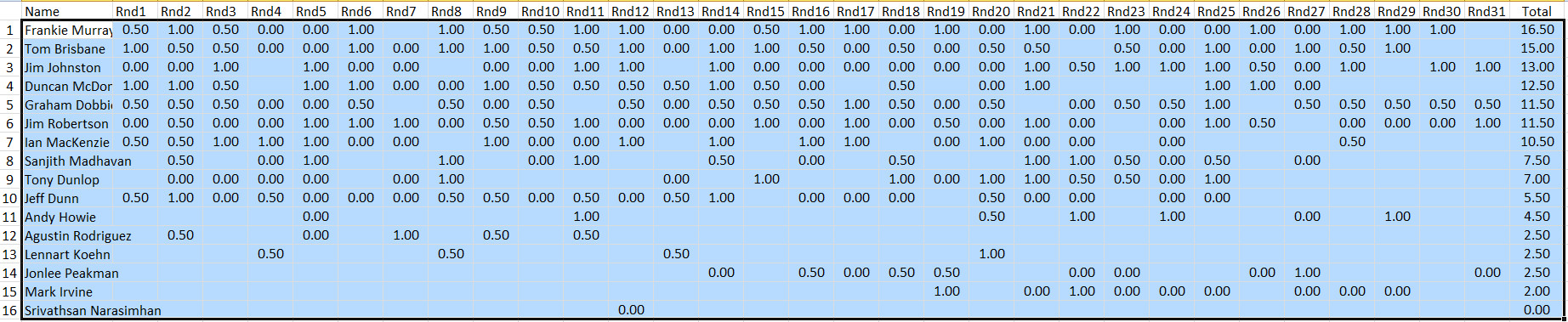 Performance in games played against other club members: